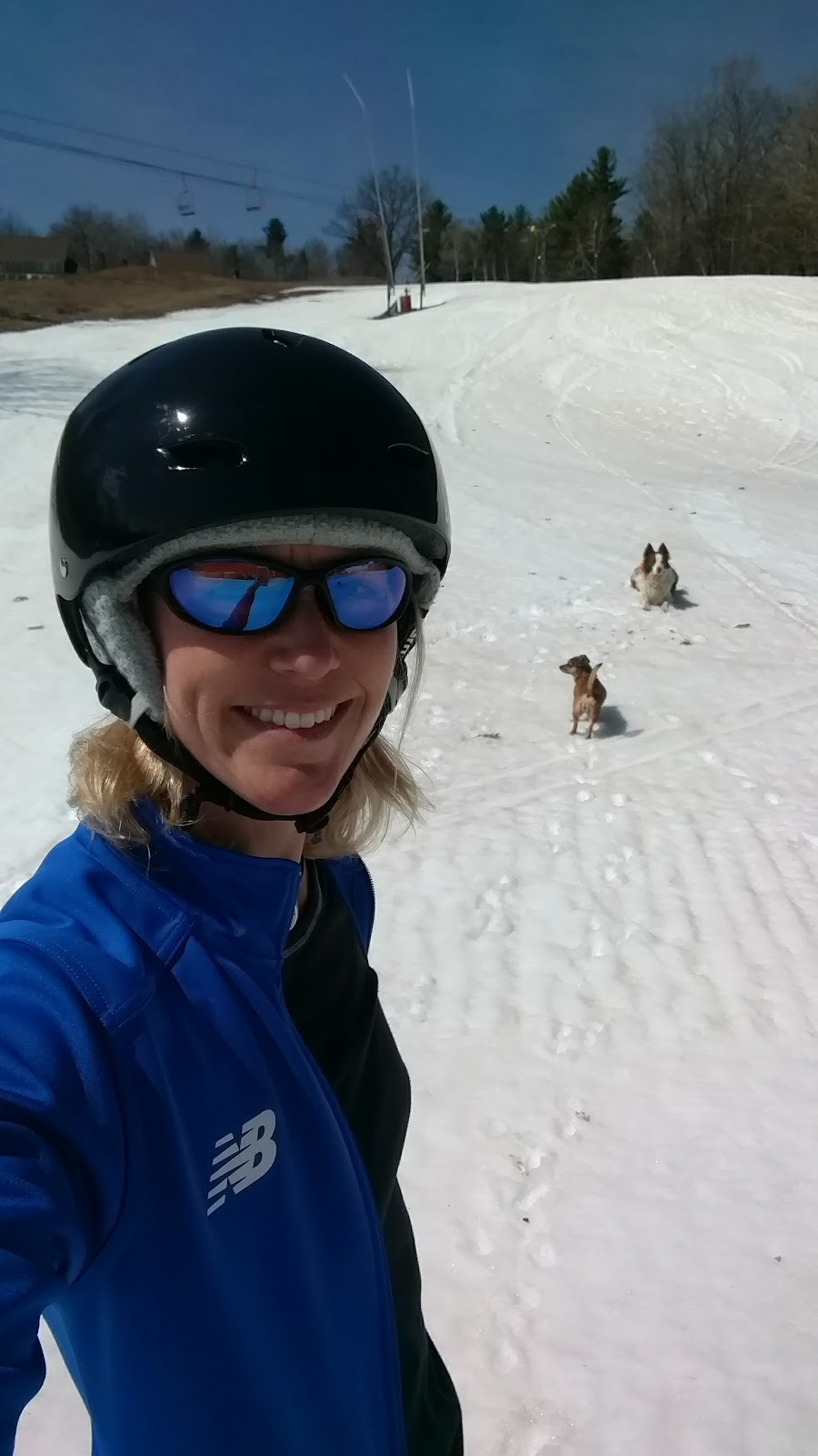 Saturday, April 15, 2017- Yet another beautiful day!! I hated going to the gym, but I needed to get on the elliptical. Dragged John along. Did another 5 mile workout in 45 minutes, but I did the random program which was much more difficult than the hill one. Once again pouring in sweat. I actually took a quick shower this time, then John, the dogs and I drove up to Black Mt to ski! What's that, you say? Yes, ski on April 15th. The latest Black Mt has ever been open. It was close to 70 degrees and the snow was slush, but it was so much fun to get out there one last time this season. After our runs, I let the dogs out to run on the ski slope, then John and I had drinks on the deck. It was so nice.