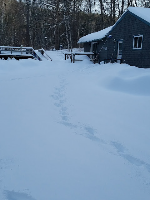 I did an upper body and abs workout when I got back, and then just did stuff around the house the rest of the day. In the afternoon, Bryan let us know that he picked up a shift at work the next morning and that John would have to make his way to the school van stop on his own. Great. John's first time riding the van and he has to do it alone. I wasn't keen on this, but I went out and packed him down a trail in the snow to walk there. Then I brought him out and made him walk it with me so he'd know where to go. Funny that he had to walk to his "bus" stop on snowshoes. SO New Hampshire! Haha.
