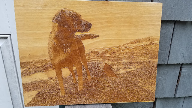 Don Fredrikson stopped by to drop off a portrait of Spot that his boss had experimented with on wood. It came out really neat. I still miss my Spot dog.